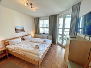 Unsere Wohnungen sind ideal für einen erholsamen Urlaub. Im Außenbereich erwarten Sie vier bequeme Alustapelsessel und ein runder Tisch – perfekt für entspannte Stunden an der frischen Luft. Im Hauptschlafzimmer schlafen Sie komfortabel in einem Doppelbett (180×200). Ein Kleiderschrank, eine Kommode und ein TV sorgen für zusätzlichen Komfort. Das zweite Schlafzimmer bietet zwei Einzelbetten (90×200), einen Kleiderschrank und einen Schreibtisch – ideal für Kinder oder Gäste.