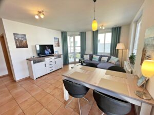 Die helle und freundliche Ferienwohnung verfügt über einen Wohnbereich mit Sitzgruppe & Flat-TV, eine komplett ausgestattete Küchenzeile, ein Schlafzimmer mit Doppelbett ( 1,80m x 2,00m) und zusätzlichem Flat-TV sowie ein zweites Schlafzimmer mit zwei Einzelbetten.