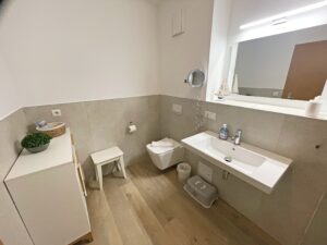 Das Bad verfügt über eine ebenerdige Dusche (mit Klappsitz und Haltegriff) und Toilette (klappbare Haltebügel).